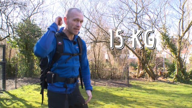 Rygsækken skal være fyldt med 15 kg sten, sand eller andet - og så skal du afsted i et højt tempo i 30 minutter.